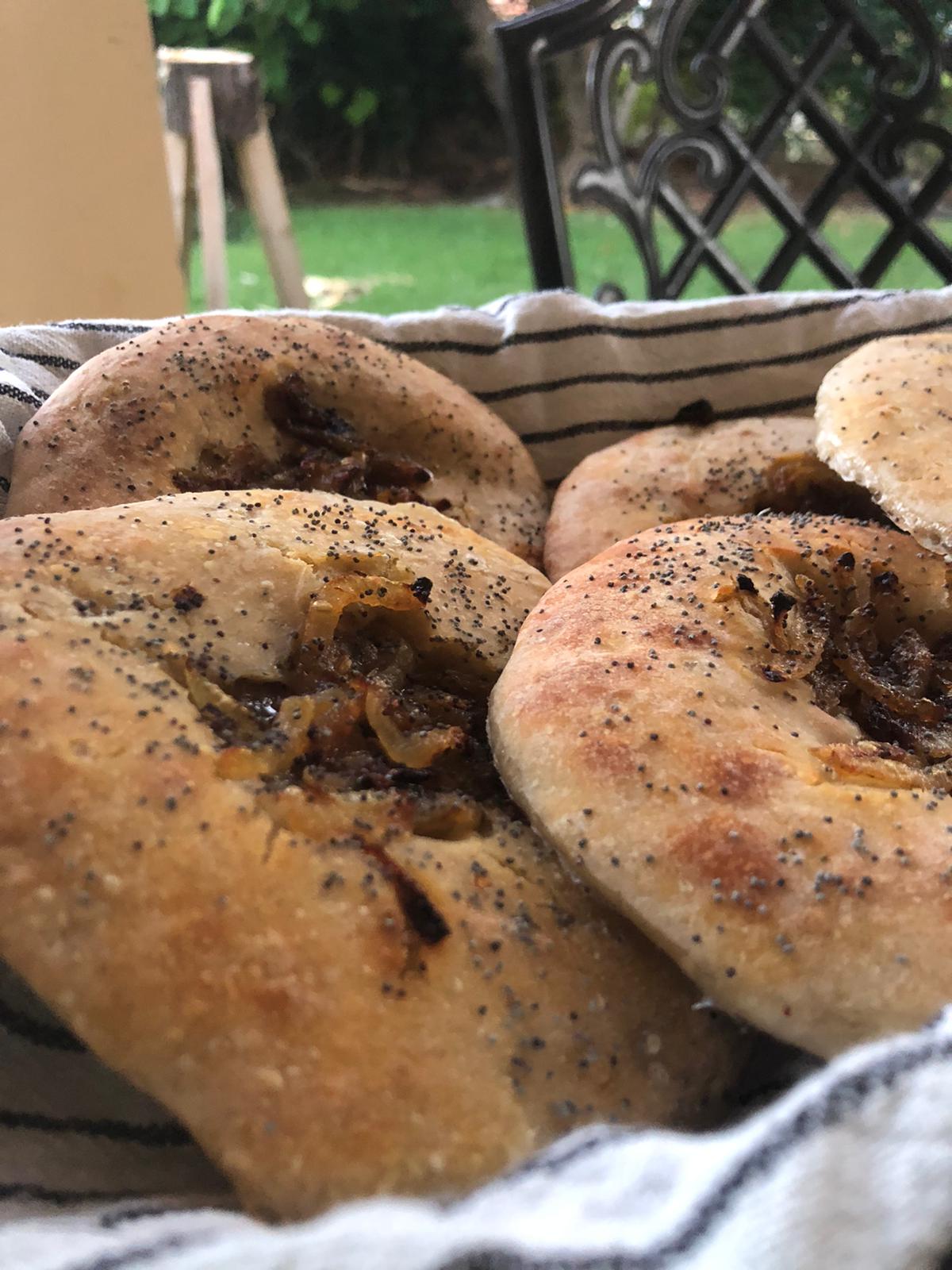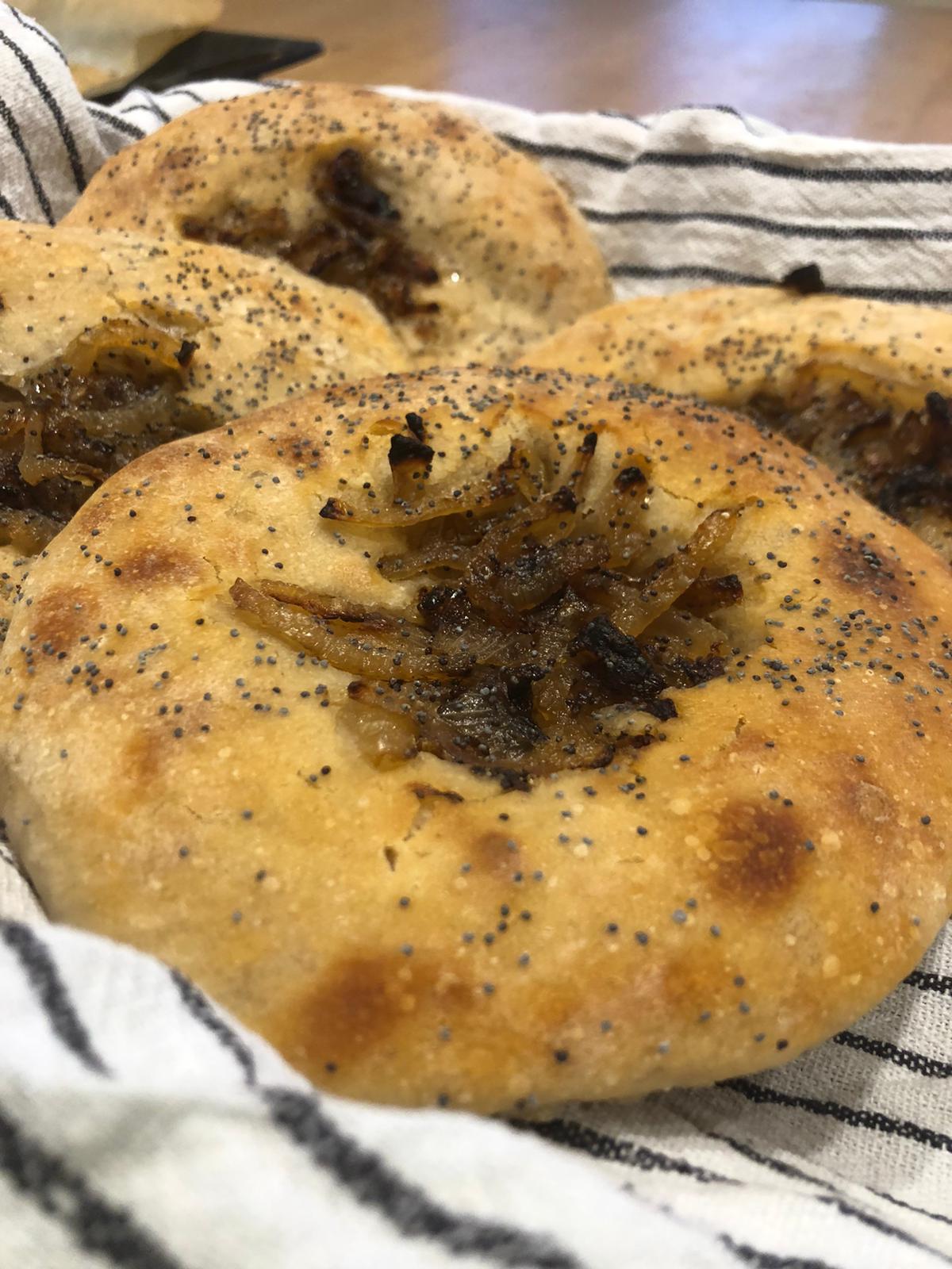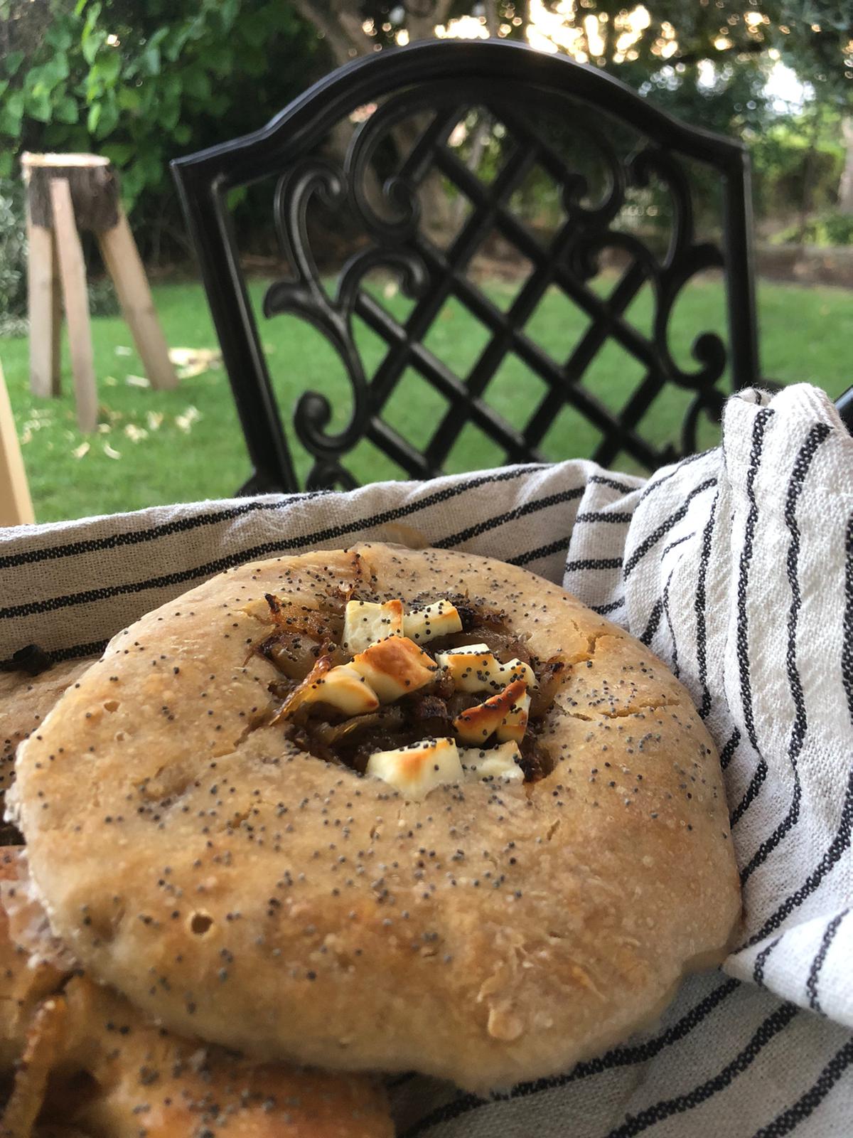 עם בצל מוקפץ בשמן זית משובח, מלח גס, ופרג